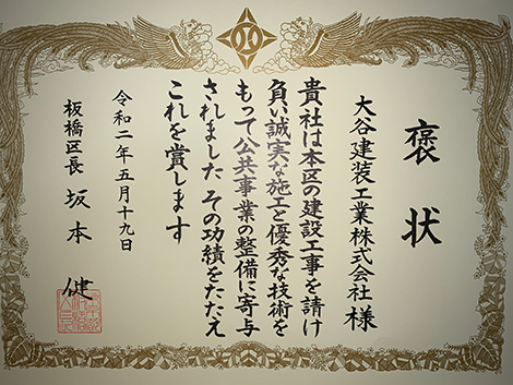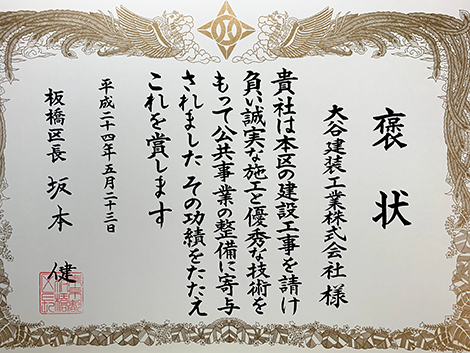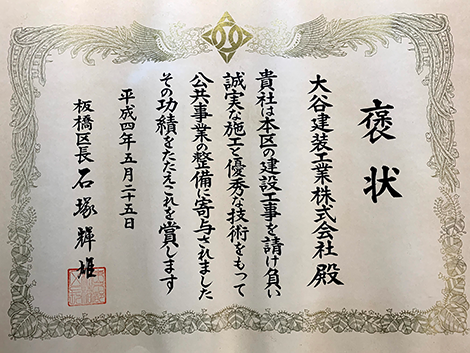 平成4年板橋区褒状、平成24年板橋区褒状、令和2年板橋区褒状